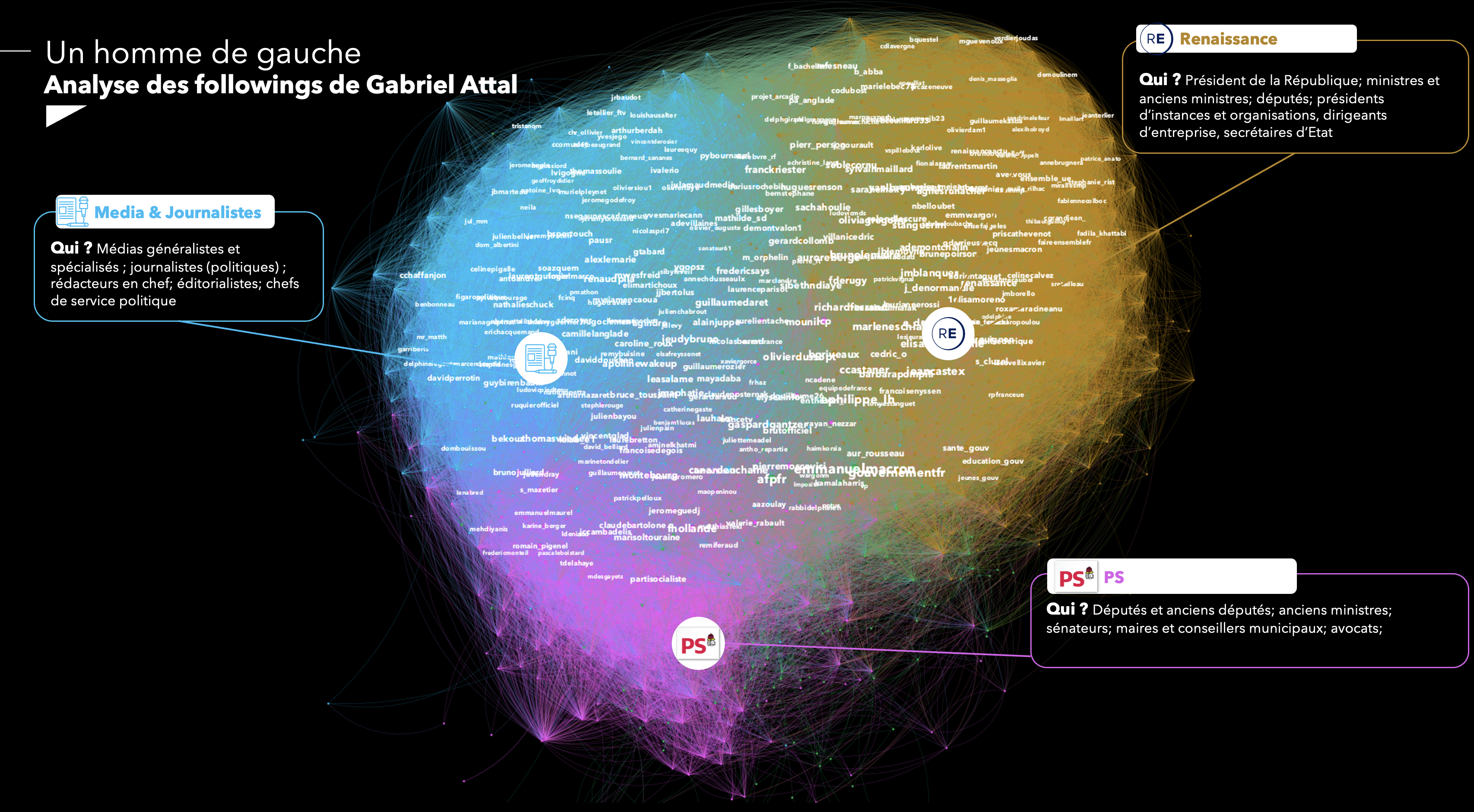 Ses following font rejaillir essentiellement le fait qu’il s’agisse d’un homme de gauche avec une communauté Renaissance, le Parti Socialiste et les médias & journalistes.