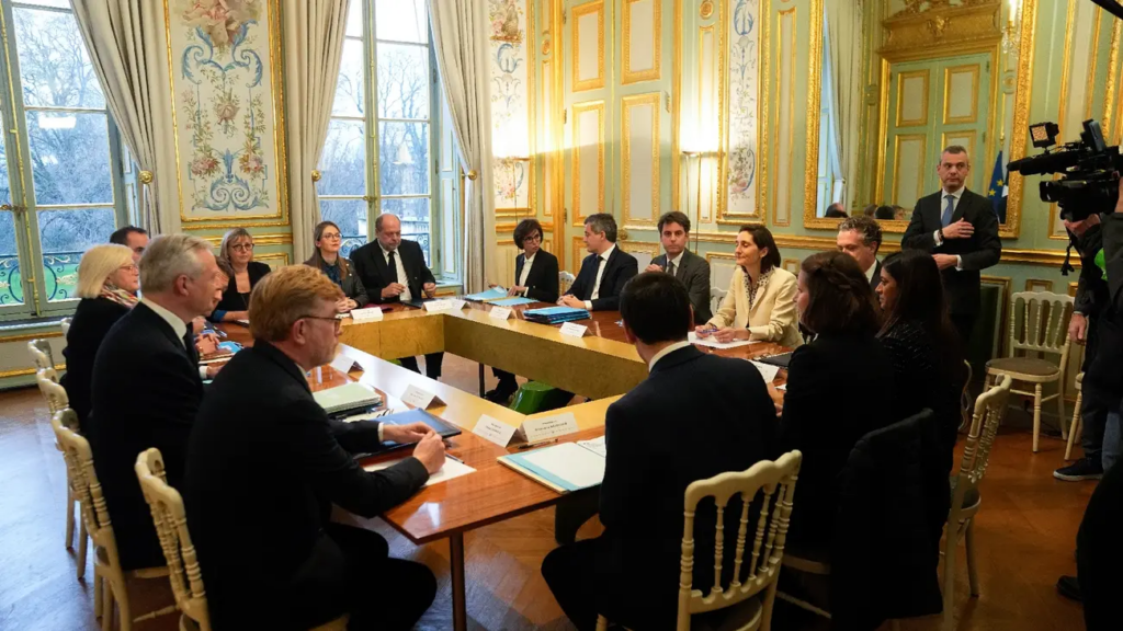 - Enfin une troisième phase avec le Gouvernement Attal. Macron veut taper du poing sur la table en montrant un gouvernement resserré, le plus resserré pour que cela aille vite et que le gouvernement soit soudé. Le drapeau européen et français est toujours bien présent.
