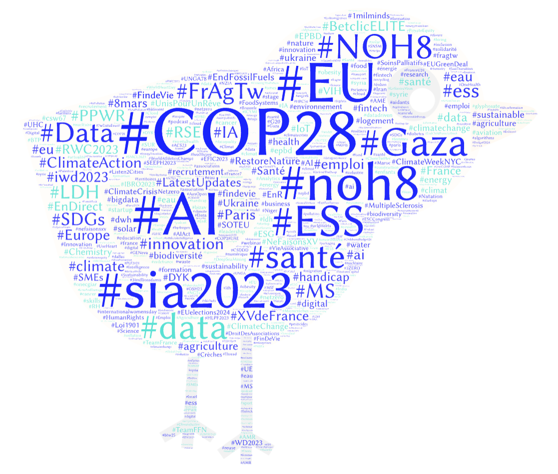- 15% sont des hashtags de participation ou d’organisation d’un événément. Les 2 premiers hashtags les plus tweetés sont des événéments. (Cop28, SIA2023) Le IWD complète le podium en 20 ème place générale. Sinon ce sont les élections européenne et le 8 mars qui sont importants.