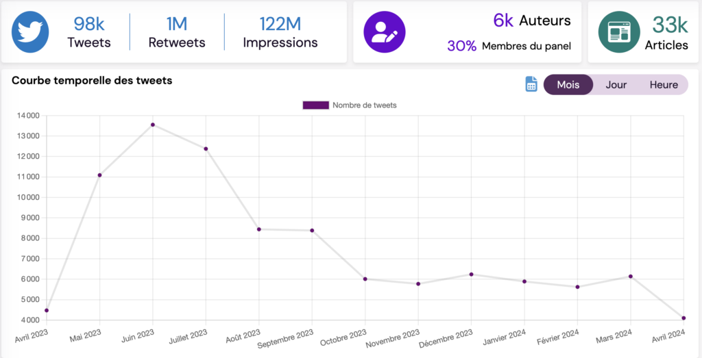 Dans le panel Follaw, les tweets sont plutôt en décroissance avec d’énormes pics à l’occasion des émeutes.