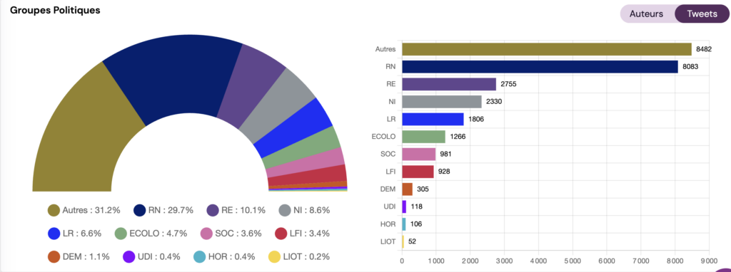 Analysons désormais les prises de parole sur les réseaux sociaux pour voir qui s’exprime le plus sur le sujet. Et là, une évidence : le rassemblement national explose toutes les volumétries sur le sujet et il s’agit d’un thème très porteur pour eux. Renaissance n’est pas en reste et occupe le terrain, bien plus que LR.