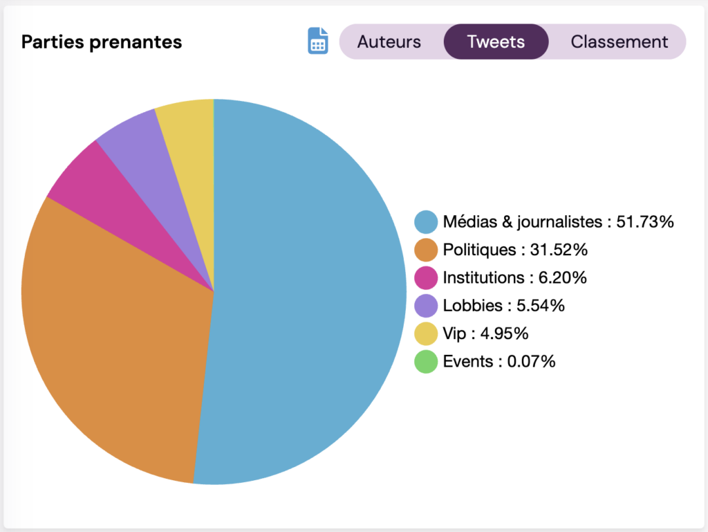 - Quelles parties prenantes prend le plus la parole sur le sujet sur X ? Les politiques, les lobbies ou les médias ?