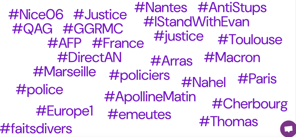 Lorsqu’on regarde les mots-clés les plus abordés, on se rend compte que des villes sont particulièrement citées (Nice, Nantes, Marseille, Cherbourg, Paris), des faits divers (hashtags génériques, Thomas, Nahel, Arras) et des hashtags proches de médias appartenant à RMC / BFM.