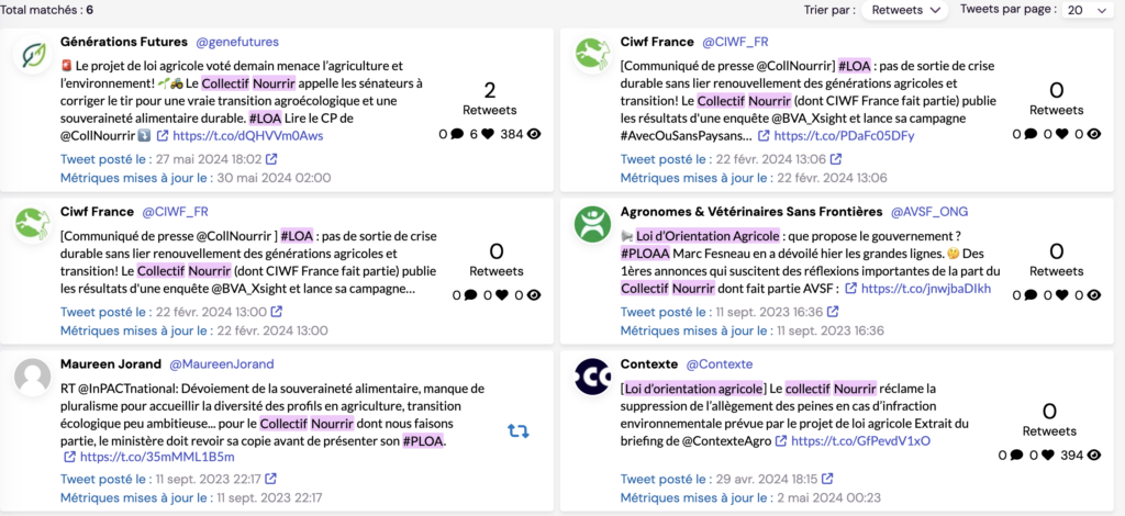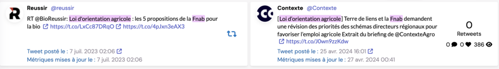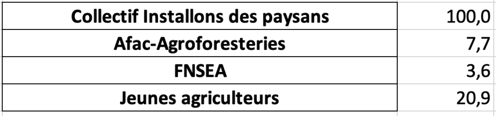 Signalons que le collectif « Installons des paysans » est la confédération paysanne (et celle-ci a 0% sur ceux annoncés comme tels hors doublon) , que les Jeunes agriculteurs ont eu un très beau taux de conversion et que l’agroforesterie. Le grand perdant est le collectif Nourrir avec pas moins de 39 amendements annoncés (et donc bien plus avec les doublons non-annoncés comme telles) et pour cause : ils sont allés uniquement sur les sphères NUPES/ECOLO en ordre dispersés. Cette ordre dispersé est là jusque dans les datas avec des mentions d’uniquement 2 membres, puis un seul, etc.