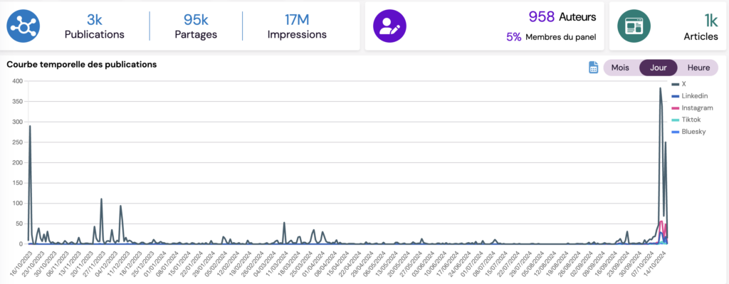 3. Fragmentation des thématiques : L’analyse des publications montre une polarisation des conversations. D’un côté, le gouvernement et les acteurs laïques se concentrent sur l’aspect mémoriel et la laïcité, tandis que l’extrême-droite exploite le thème pour parler d’islamisme et d’immigration.
