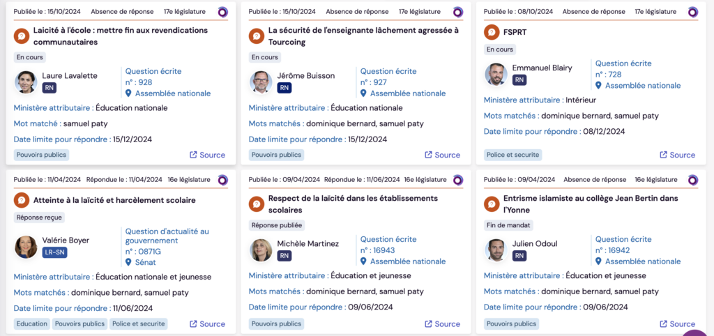 2. Réactivation des débats politiques : Ces commémorations suscitent des questions au gouvernement, notamment des groupes comme le Rassemblement National (RN) et Renaissance. Ils permettent de réactiver des questions ou des mesures décidées au préalable ou de pointer du doigt les atteintes à la laïcité. Pour autant, les acteurs de l’éducation n’émergent pas réellement.