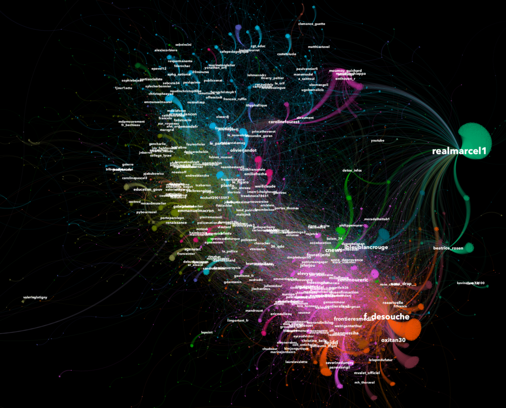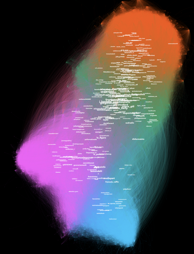 Les conversations sont scindées en deux : (le graphe montre les interactions en mentions ou retweets entre les comptes, plus un compte est gros plus il a reçu de l’engagement et une couleur est une communauté)