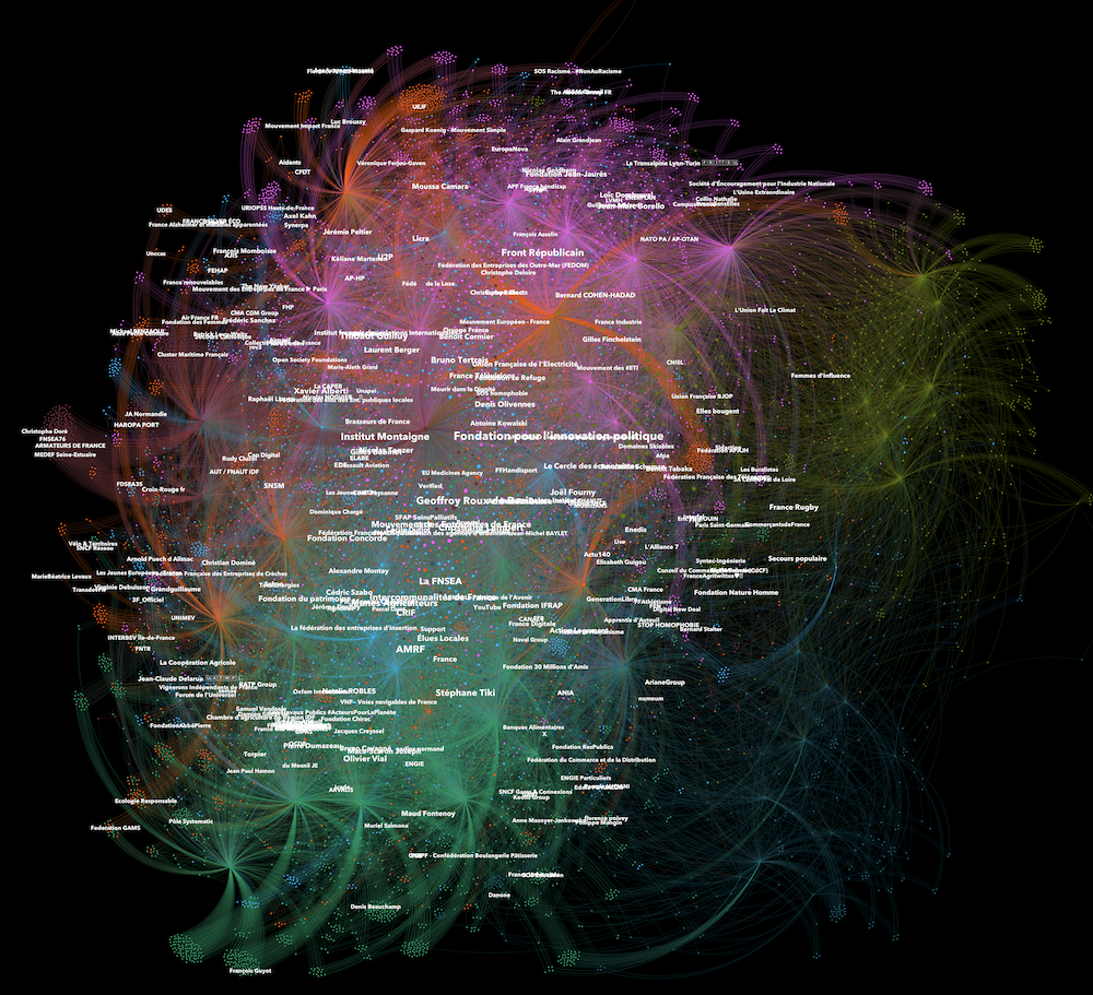 En cartographiant les suivis des différents ministres (ce sont les seuls liens affichés dans l’image) , montrant uniquement ici les lobbies ( ce qu’on appelle les labels, soit ce qui est écrit) e en attribuant la taille selon les acteurs les plus suivis Intéressant, on ne distingue pas vraiment de communautés particulières.
