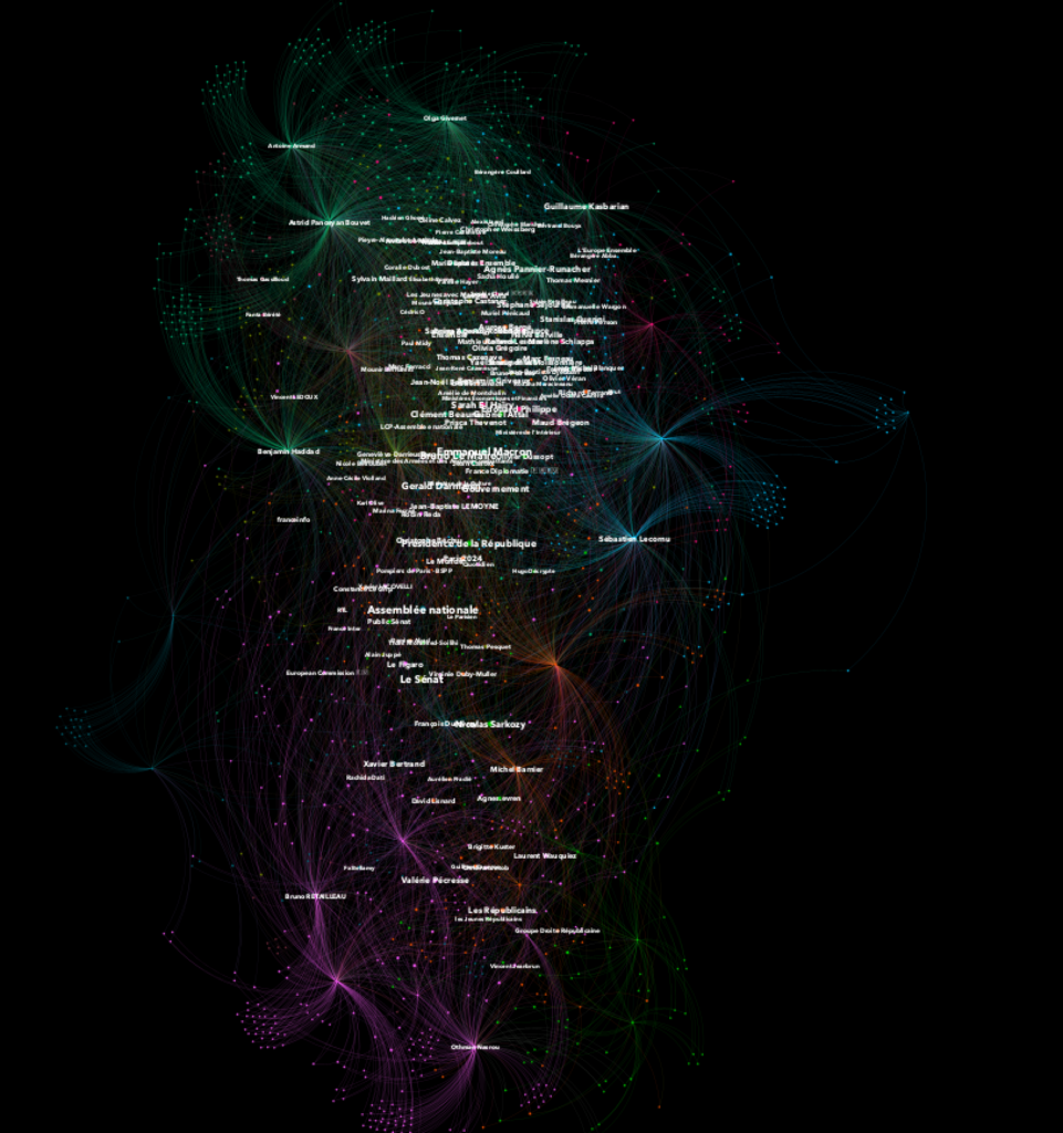 En gros on se suit entre amis politiques ou entre confrères. Mais il n’y a pas la logique médiatique et influence de X sur Instagram. Les communautés (symbolisées par des couleurs) sont assez claires : on voit en bas du graphe une communauté LR très légère, alors que sur le haut du graphe, c’est l’axe EPR.