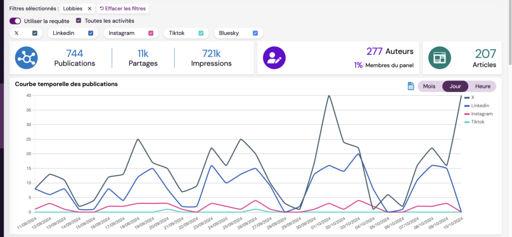 Car au niveau des groupements d’intérêts, il a été très difficile de réagir vite. Et cela se voit (voir notre étude de la semaine dernière) : seules les associations de gauche telles qu’Oxfam, Attac, Unapei, les groupements d’intérêts autour de la transition écologique. (Construction, automobile) ou ceux de La santé( LEEM) ainsi que les syndicats ont déjà publié. En un mois, les publications sont ainsi microscopiques. ( à peine 744 publications, retweets et tous réseaux confondus….)