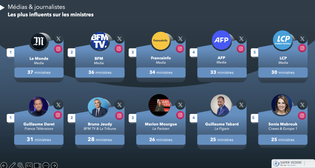 - La première clé est que les réseaux sociaux seront moins importants qu’avec les précédents gouvernements. Notre méthodologie basée sur les pratiques de following des ministres semble assez éloignée des réalités actuelles. La faute à X qui depuis la prise de contrôle de Musk fait peur aux politiques et lobbies. Mais aussi le fait que la pratique de following n’est plus tant importante pour ceux qui reprennent en la communication des politiques.
