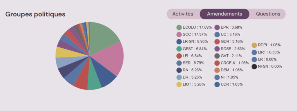 Autre observation instructive à relever d’après l’outil Follaw.sv : les élus parlementaires des groupes socialistes et écologistes sont particulièrement mobilisés sur le dossier du financement des infrastructures de transports. A eux seuls, ils représentent plus d’un tiers des amendements déposés (17,89% pour les Verts et 17,37% pour les socialistes). Ils se situent loin devant le 3ème groupe le plus actif, à savoir les sénateurs des Républicains (8,95%).