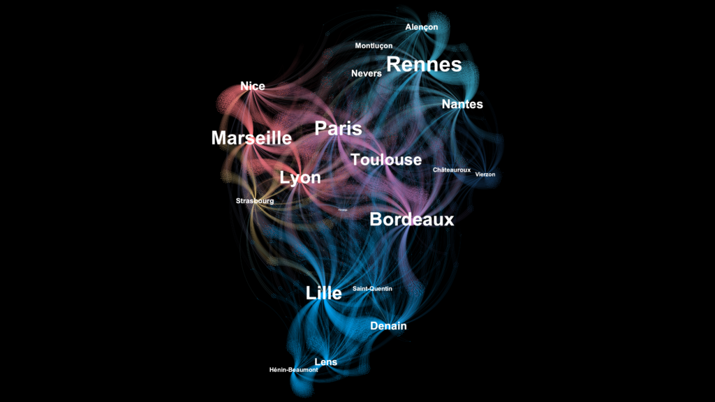 Et pour cause , on peut observer, dans les audiences, que les comptes géographiquement proches partagent des audiences similaires, ce qui montre qu’ils interagissent l’un avec l’autre. De même, les métropoles sont plus connectées entre elles qu’avec des régions éloignées.