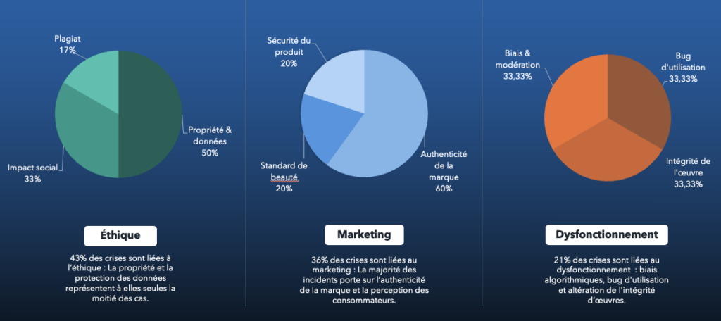 - Dysfonctionnement : 21% des crises sont liées au dysfonctionnement : biais algorithmiques, bug d’utilisation et altération de l’intégrité d’œuvres.