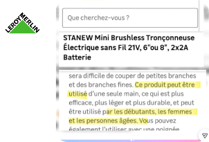 L’enseigne spécialisée dans le bricolage et la décoration a dû retirer en urgence la notice technique d’une tronçonneuse en vente en ligne. L’outil y était présenté comme facile d’utilisation, pouvant convenir « aux femmes et aux personnes âgées ». Ces « préconisations » ont été repérées par l’association Pépite Sexiste et dénoncées sur son compte Instagram en l’accompagnant d’une légende piquante : « Il suffit d’une seule main pour tronçonner le patriarcat, tout le monde peut s‘y mettre ». La publication a suscité un flot de commentaires narquois : « Ils l’ont en rose ? J‘ai peur de ne pas savoir m’en servir sinon », « Et avec des paillettes ? » Face à cette polémique, Leroy Merlin s’est excusé, a remercié pour l’alerte et a retiré le produit, en promettant d’être plus vigilant.