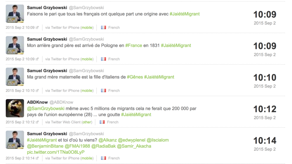 Petit à petit, chacun se retrouvant dans ces mots vont donner leur « j’ai été migrant » recevant des retweets qui feront grossir le hashtag :