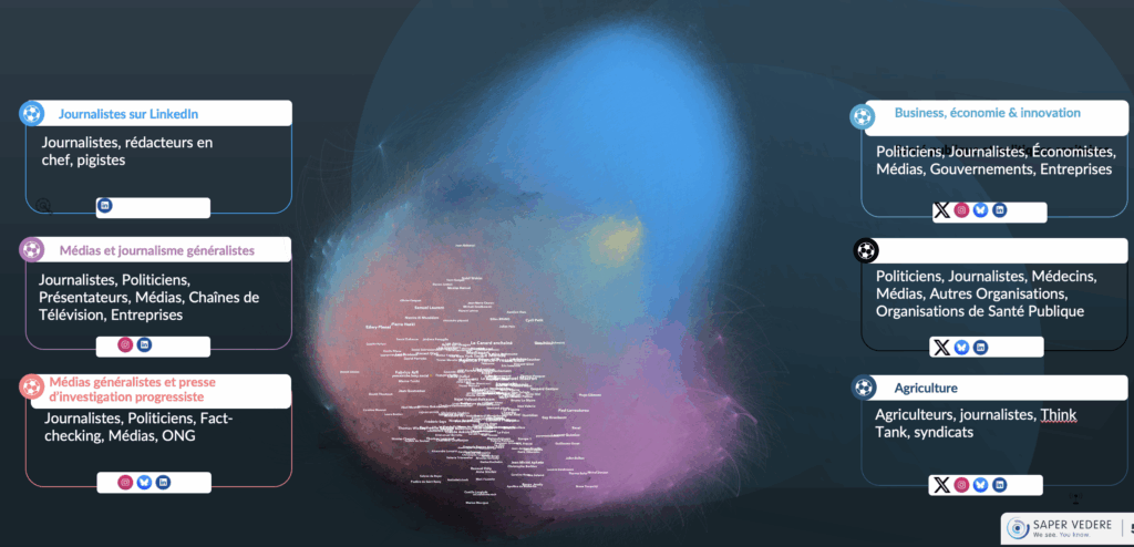 Commençons par le fait que nous avons développé une méthodologie unique et phare : l’écosystème 360. Avec pour objectif de comprendre tous les réseaux où il y a une présence de décideurs, aussi petite soit-elle, dans le but d’obtenir le maximum d’opportunités. Les métadonnées des acteurs sont donc multipliées par six (Threads, LinkedIn, X, Instagram, Bluesky et TikTok). Nous disposons de 100 métadonnées sur chacun des acteurs, et leurs liens avec les autres sont absolument complets et exhaustifs.